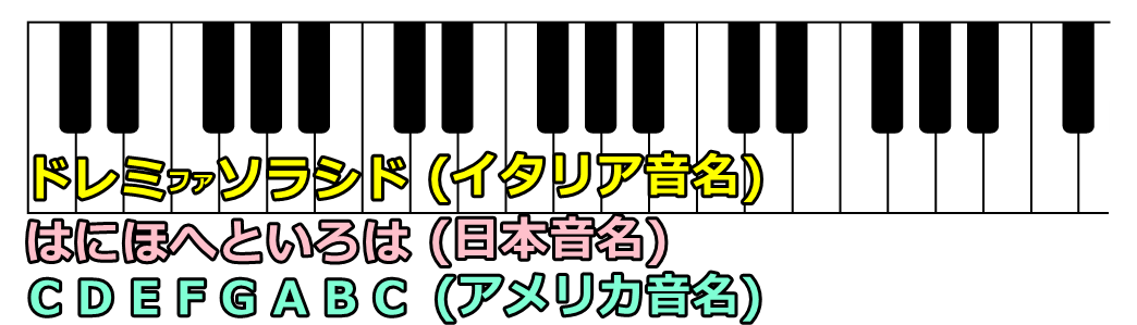 「ドレミファソラシド」というのはイタリア音名、「はにほへといろは」は日本音名、「CDEFGABC」はアメリカ音名というように、各国での音名の呼ばれ方に違いが有りますが、この三種類の音名を覚えておけば問題ありません。