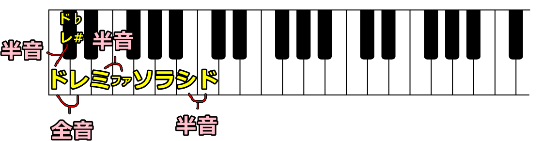 ただ、「ミ」と「ファ」、「シ」と「ド」の間には黒鍵が無いので、「ミ」と「ファ」。「シ」と「ド」の音程差は「半音」となっています。