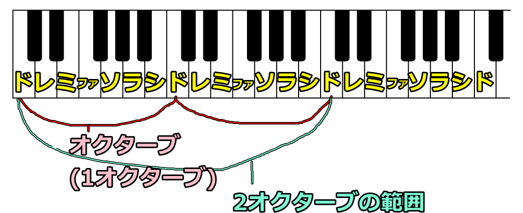 また、オクターブが1つの範囲の事を「1オクターブ」(いちオクターブ)、オクターブが2つの範囲の事を「2オクターブ」(にオクターブ)と言います。