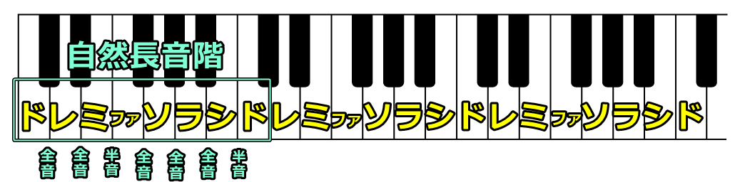 「自然長音階」というのは、英語では「ナチュラルメジャースケール」と呼ばれていて、ある音から1オクターブ上の同じ音名の音まで「全音・全音・半音・全音・全音・全音・半音」という音程差で階段状に音が並んでいる音階の事です。