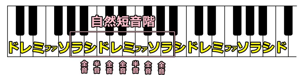 例えば、「ラシドレミファソラ」というのは、「全音・半音・全音・全音・半音・全音・全音」という音程差で並んでいるの自然短音階となります。